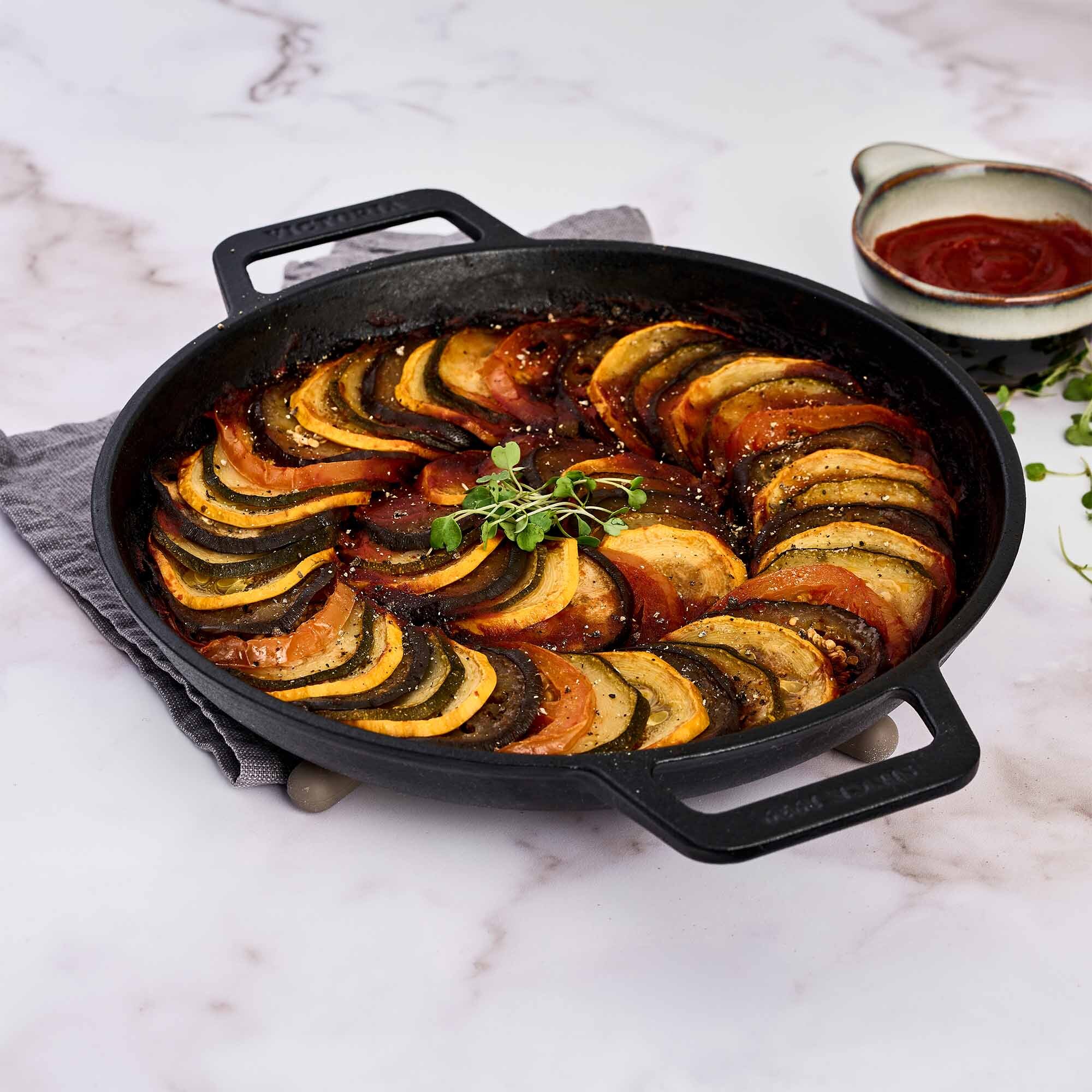 Met de Victoria Skillet 25 cm Double Handle Dishwasher Safe kies je voor professioneel kookgerei dat meerdere kook-stijlen beheerst. Het gietijzeren materiaal zorgt voor uitstekende warmteopslag en een gelijkmatige verdeling. Hierdoor garen je vlees, vis, groenten of brood gelijkmatig en krijgt het een geweldige korst. De dubbele handgrepen geven je extra stabiliteit bij verplaatsen van pan naar tafel of van grill naar werkblad.